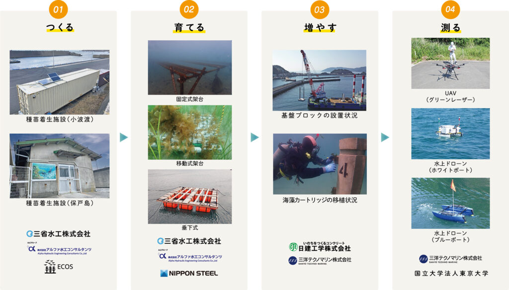 増やす:海藻カートリッジが着脱しやすく生育阻害要因に適応した基盤ブロックを開発し、280基以上で造成開始