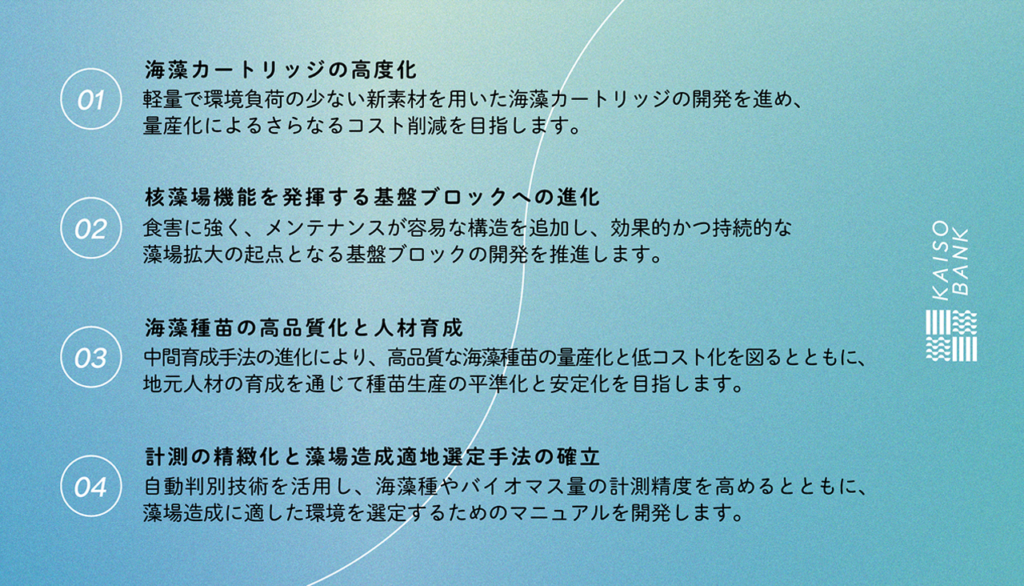 また、今後は海藻カートリッジの無償提供を通じて、全国各地の漁業者や自治体と連携し、現場からのフィードバックを蓄積します。これらのデータをもとに、海藻バンクシステムの有効性を科学的に検証し、改良と普及に努めてまいります。
